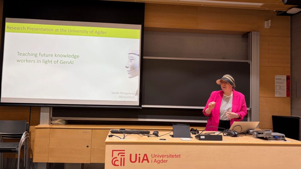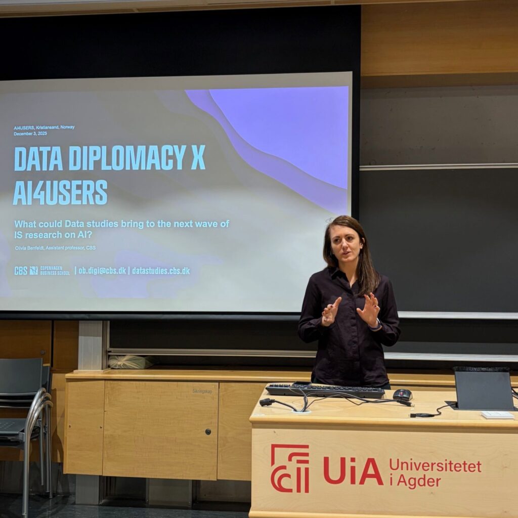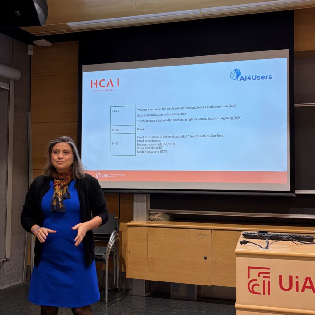 On December 3rd we hosted an academic session at UiA – Department of Information Systems where colleagues gathered to reflect on the role of data and AI in reshaping work and education, and the place of IS research in this landscape. The session included inspiring and thought-provoking presentations by Olivia Benfeldt (Assistan professor at CBS) on Data Diplomacy, and Sarah Hönigsberg (Assistant professor at ICN Business School) on GenAI enabled learning, and finished off with a meaningful dialog through a panel discussion with Olivia Benfeldt, Sarah Hönigsberg and Margunn Aanestad (Professor at UiO), moderated by Polyxeni Vassilakopoulou (Professor at UiA, Project Leader for AI4Users).